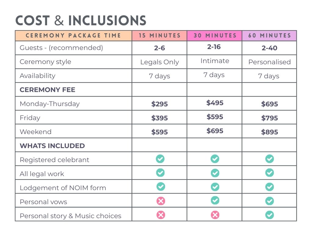 Our pricing starts from $295 for a simple legals only ceremony and up to $895 for a large ceremony on a weekend for up to 40 guests.