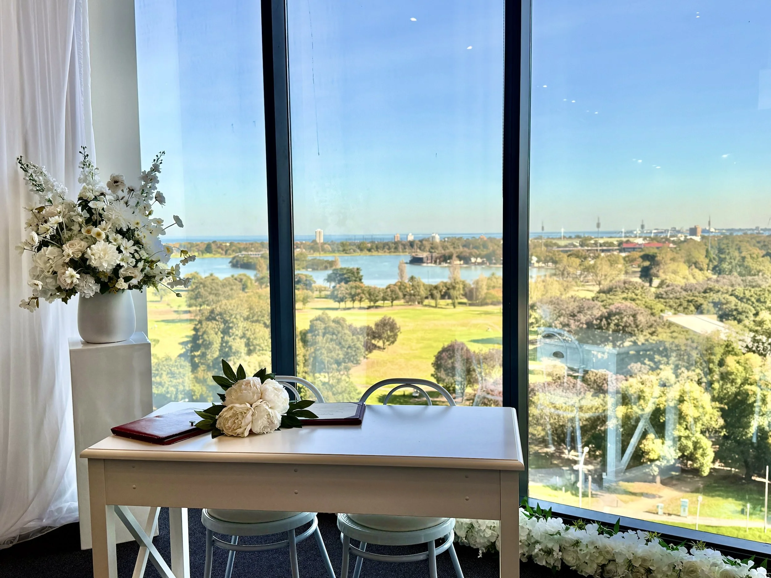 The Ivory Room is Melbourne’s loveliest wedding ceremony space for couples who want a small, elegant and effortless ceremony experience. Designed for micro weddings and elopements, the space holds up from 2- 40 guests and offers sweeping views over Albert Park Lake and Port Phillip Bay. It’s modern, calm and filled with natural light, creating the perfect setting for meaningful, memorable moments.